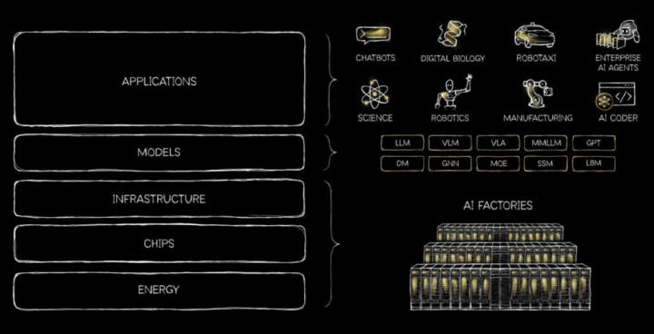 黄仁勋将AI产业架构形象地比作“五层蛋糕”:能源→芯片→基础设施→模型→应用。