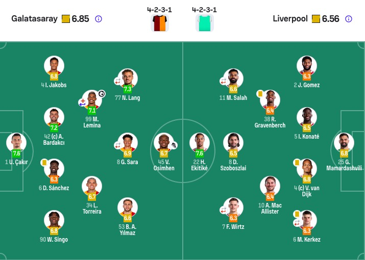 加拉塔萨雷首发:1-恰基尔、4-伊斯梅尔·雅各布斯、42-巴尔达克彻、6-达文森·桑切斯、90-辛格、99-勒米纳(77'11-阿克金)、34-托雷拉(93'17-埃尔马利)、77-诺阿·朗(77'7-绍洛伊)、8-萨拉(87'93-博伊)、53-伊尔马兹(93'20-京多安)、45-奥斯梅恩